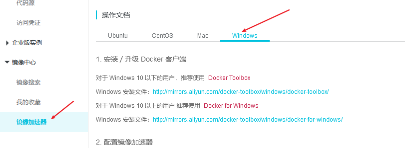 找到镜像加速器,查看配置方式,一般是win10系统,所以要参考Docker for Windows的配置方式。(可以看到这里也有Docker桌面版的镜像下载源)