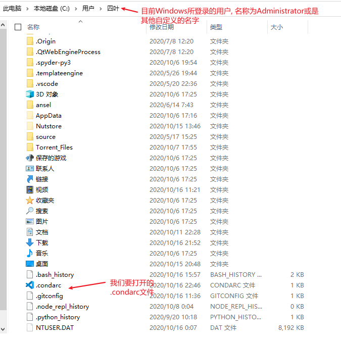 现在我们执行`conda config --set show_channel_urls yes` 会在用户目录下生成一个`.condarc`文件, 找到这个文件并打开