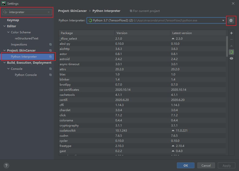在窗口中搜索`interpreter`, 找到Python Interpreter选项, 点击右侧的齿轮, 选择"Add"