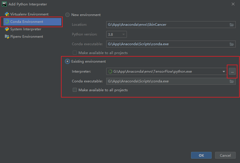 选择`Conda Environment`, 点击 `Existing environment`, 点击右边有三个点的那个按钮