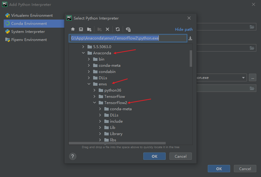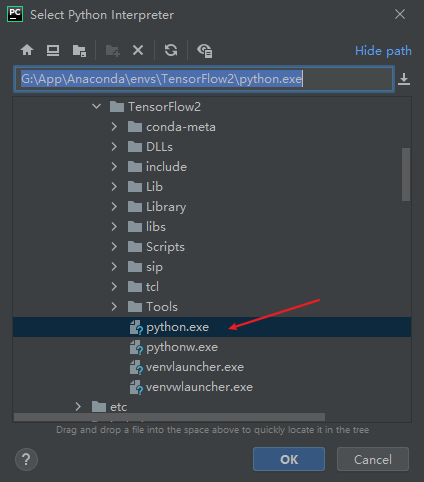 例如我刚创建了`Tensorflow2`环境, 在这个文件夹下选择`python.exe`作为我们的编译器