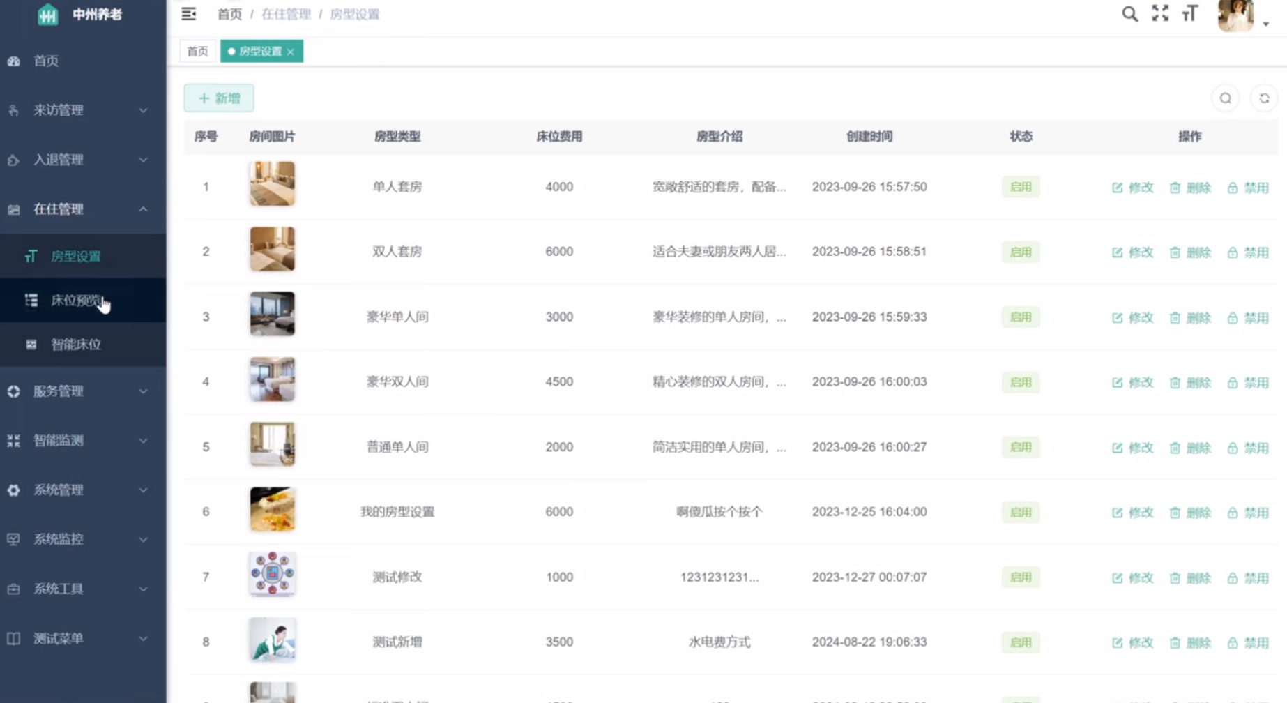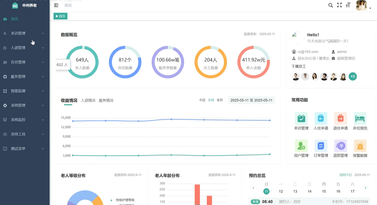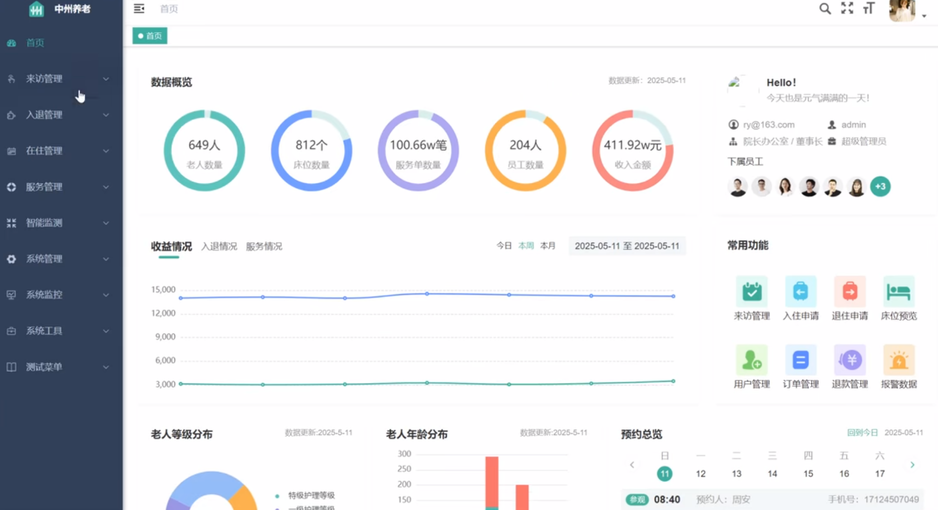 系统基于若依快速开发框架,结合养老业务,具备以下关键模块: