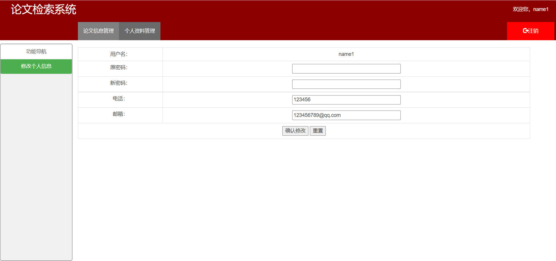 - 个人信息管理:可以修改本用户的用户名、密码、电话和邮箱