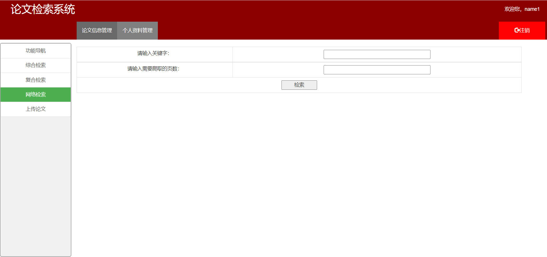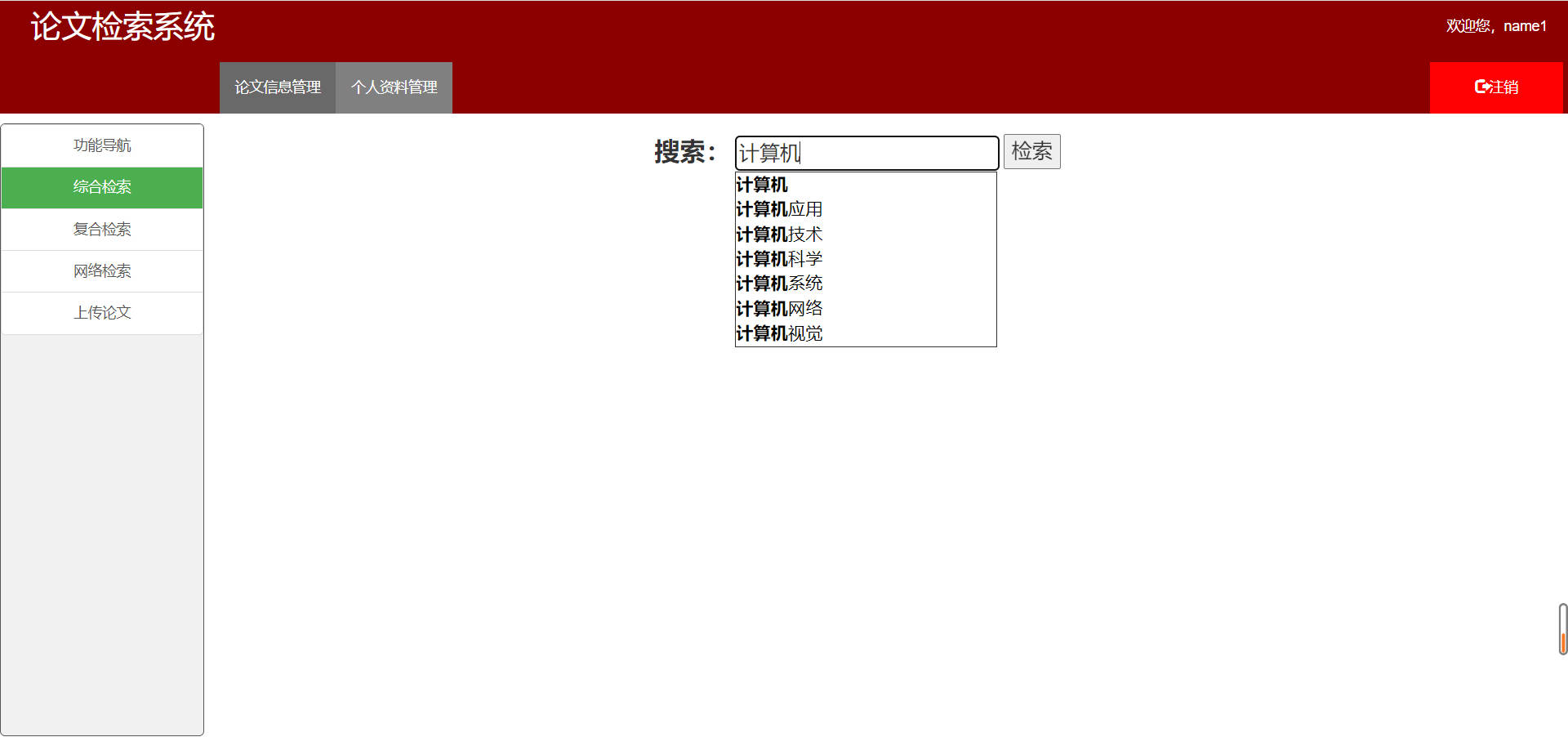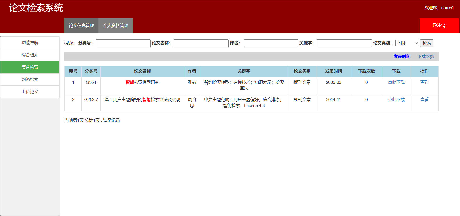 - 用户名为`name1`,密码为`123`登录论文检索系统