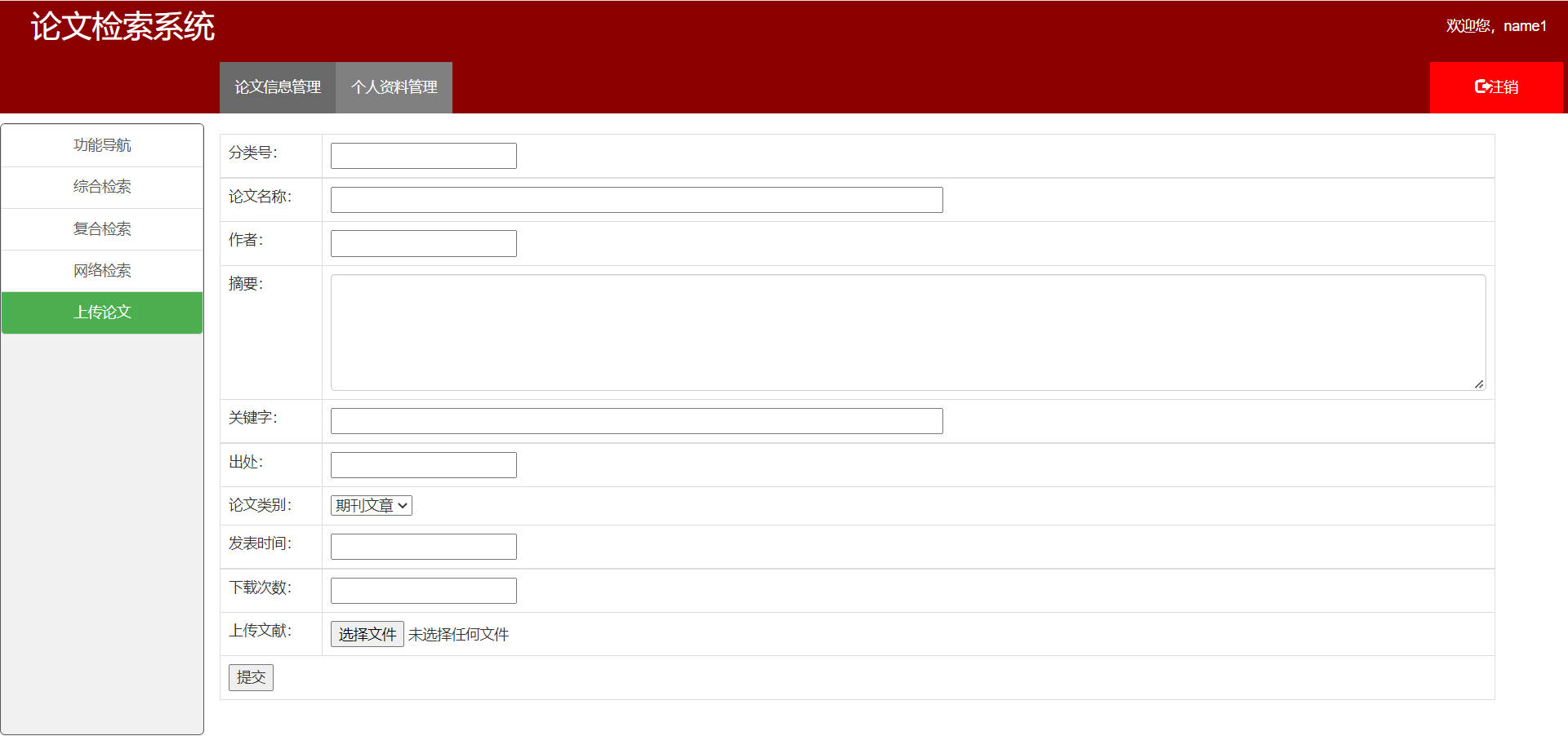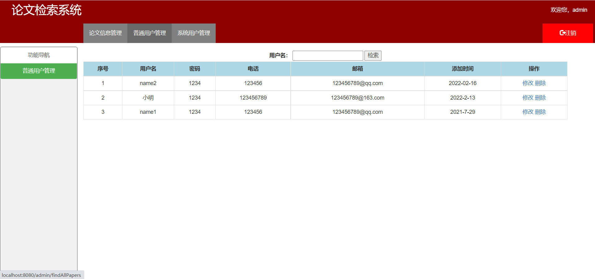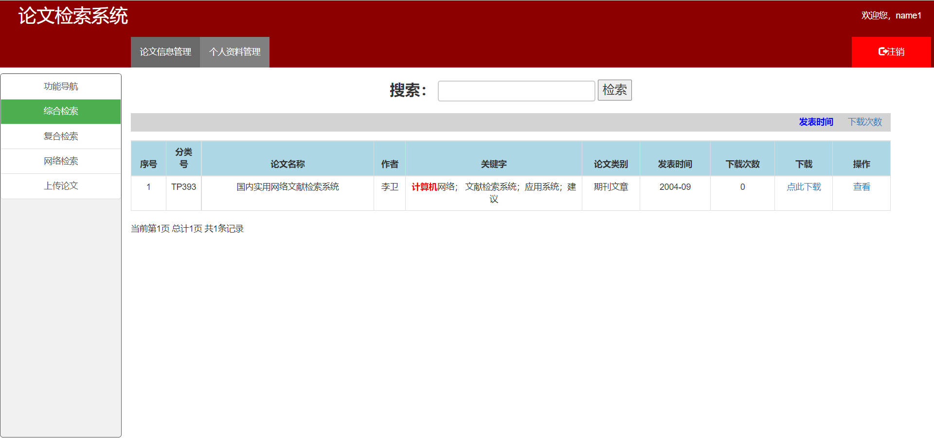 - 用户名为`name1`,密码为`123`登录论文检索系统