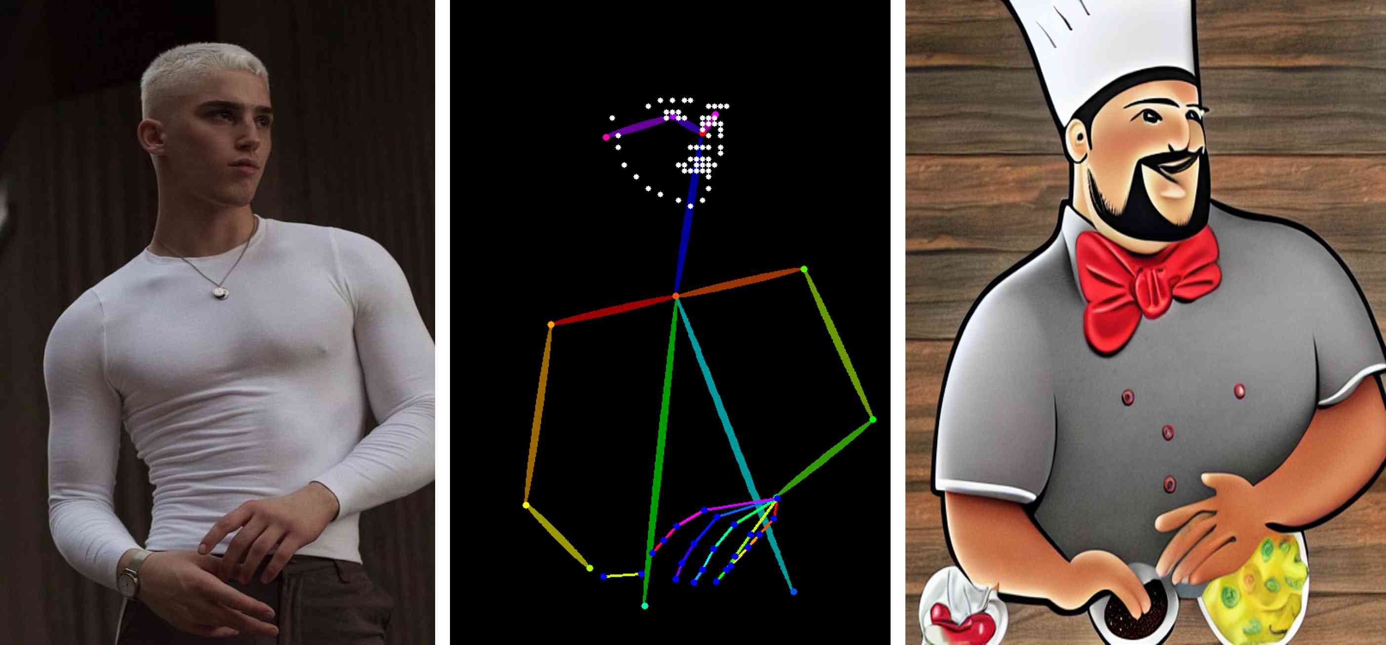 图像生成系列 - 5. OpenPose 辅助生成-姿态检测可生成图像中角色动作姿态的骨架图 - (含脸部特征以及手部骨架检测), - 这个骨架图可用于控制生成角色的姿态动作。 |