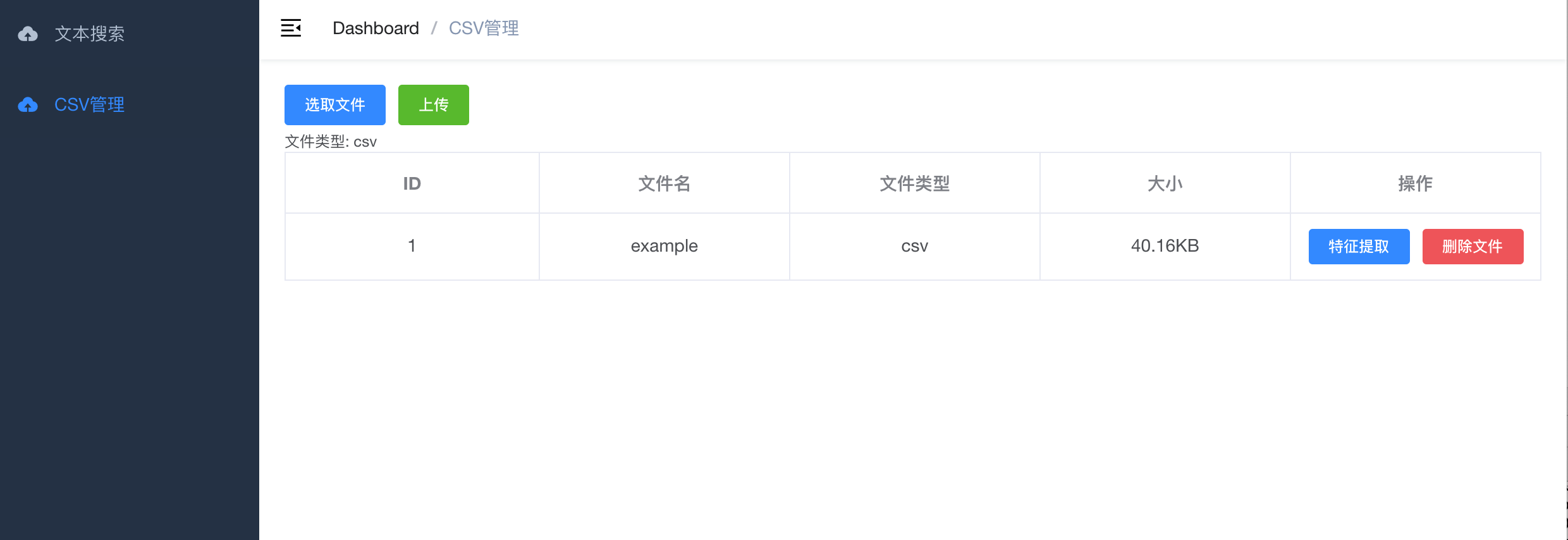 - 1). 点击上传按钮上传CSV文件. - 2). 点击提取特征按钮. |