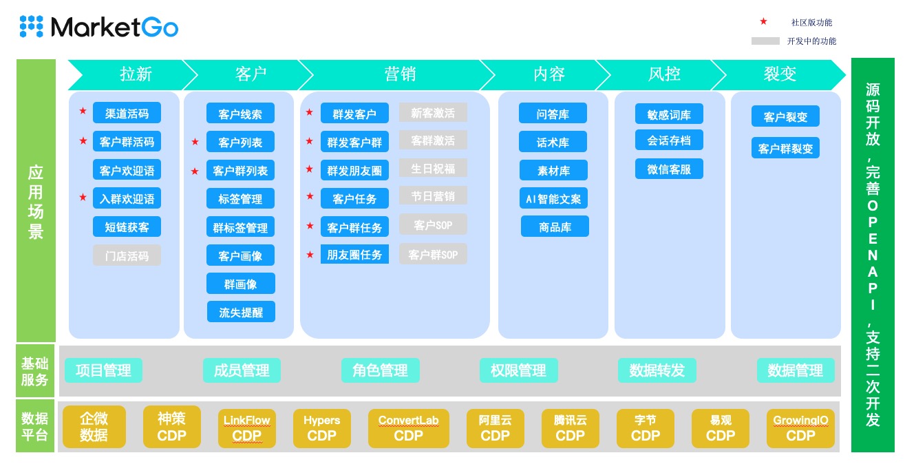 > 在这个阶段我们会提供个比较基础的企业微信SCRM功能,保留了其灵活的扩展性,便于开发者能够快速基于 MarketGo 开发自己想要的 SCRM 功能。